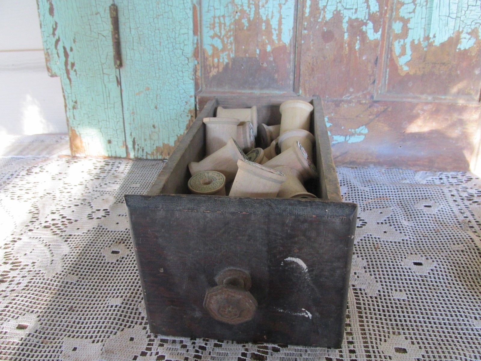 ANTIQUE VINTAGE DRAWER FULL OF THREAD SPOOLS