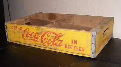 Title (ebay affiliate link): Vintage 1961 Yellow Wood Coca-Cola Soda Bottle Carrier Crate Advertising 6-Pack