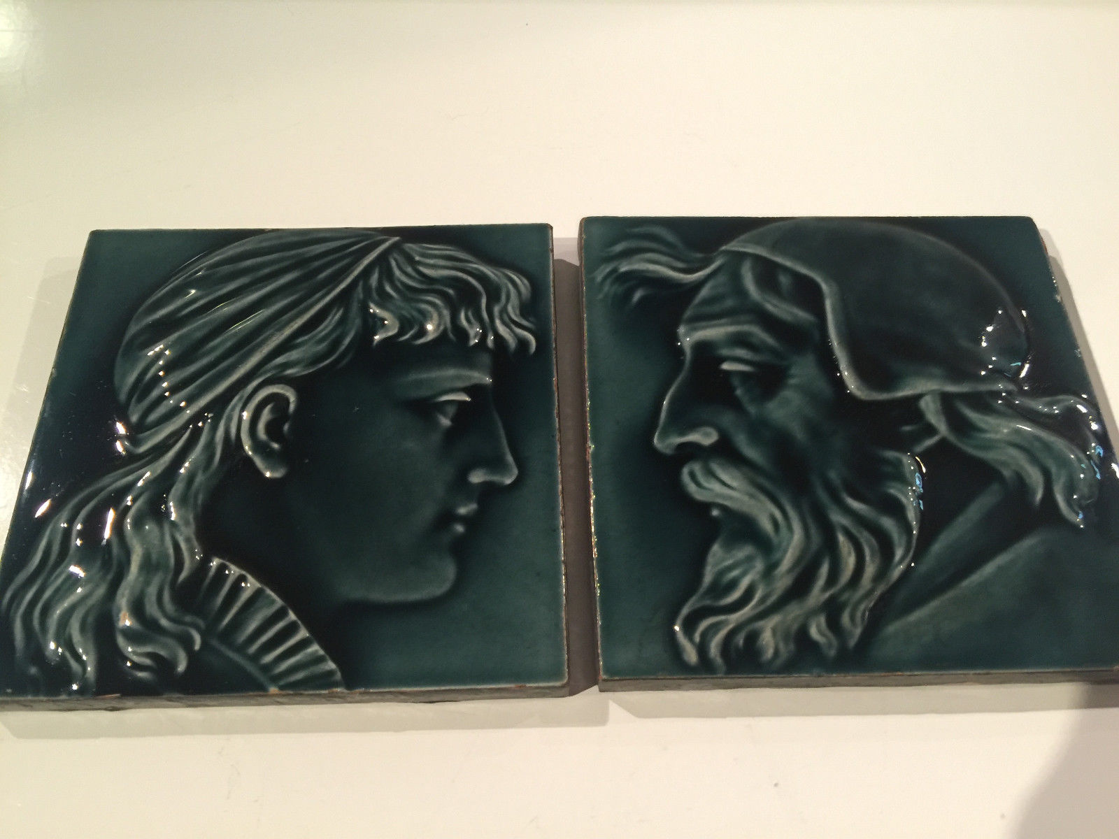 Title (ebay affiliate link): Maw Majolica Relief Pair of Portrait Tiles Venetian Woman with Scarf Man in Hat