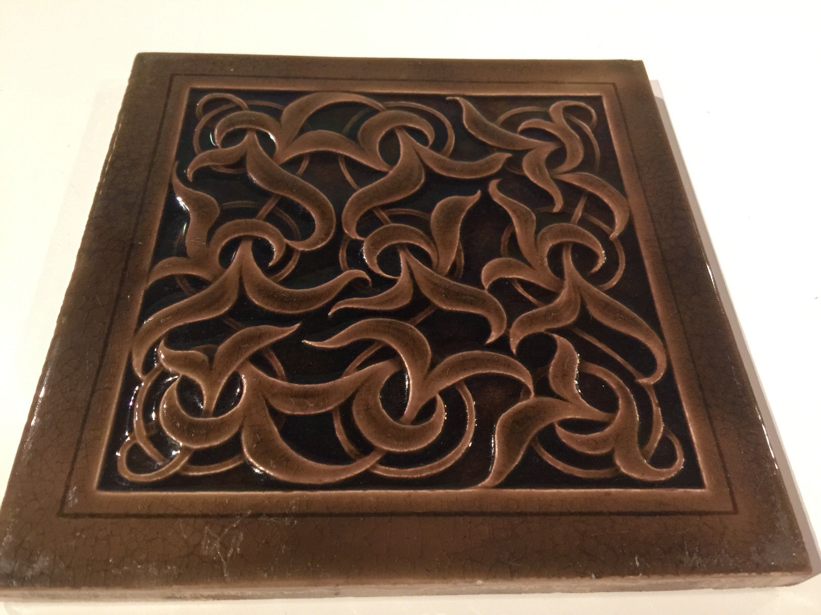 J & J G Low Majolica Relief Tile Brown Vine Leaf Design