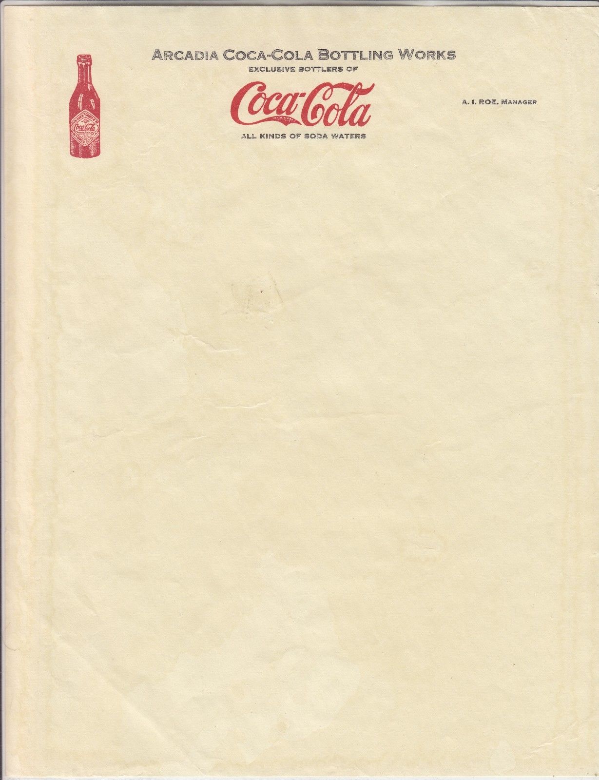 ARCADIA COCA-COLA BOTTLING WORKS LETTERHEAD UNUSED STRAIGHT SIDE BOTTLE
