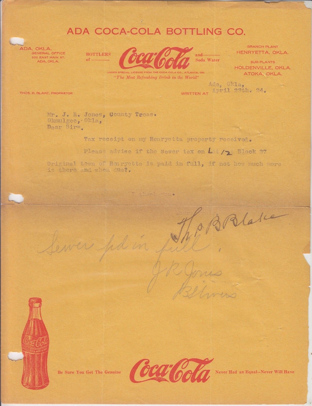 ADA COCA-COLA BOTTLING CO. ADA OKLAHOMA LETTERHEAD ALTUS OKLA. APRIL 28, 1924