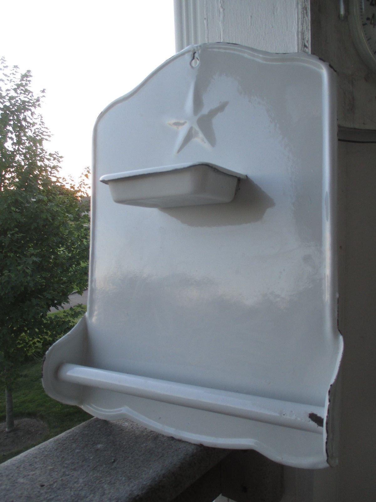 Title (ebay affiliate link): Vintage Antique Reproduction White Enamelware Wall Hanging Soap/Hand Towel