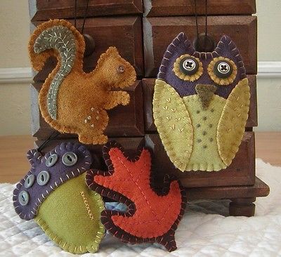 Title (ebay affiliate link): Four Fall Ornaments~Squirrel~Owl~Leaf~Acorn~Wool~Autumn