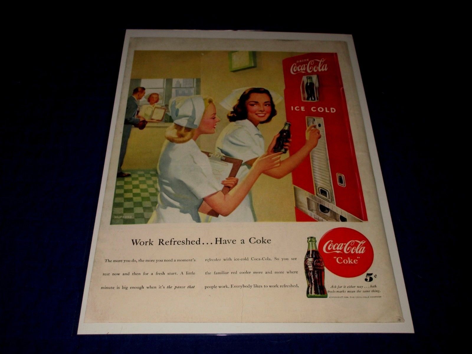 Title (ebay affiliate link): COCA-COLA-WORK REFRESHED-HAVE A COKE-NURSES AT SODA MACHINE-1948 COLOR PRINT AD