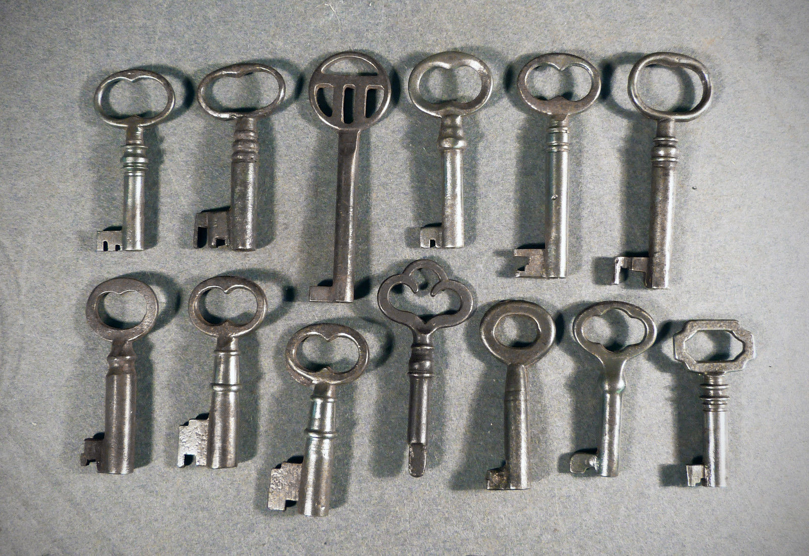 12 Antique Hallow Skeleton Keys 1 Clock? Desk, Box, Trunk, Victrola, Jewelry
