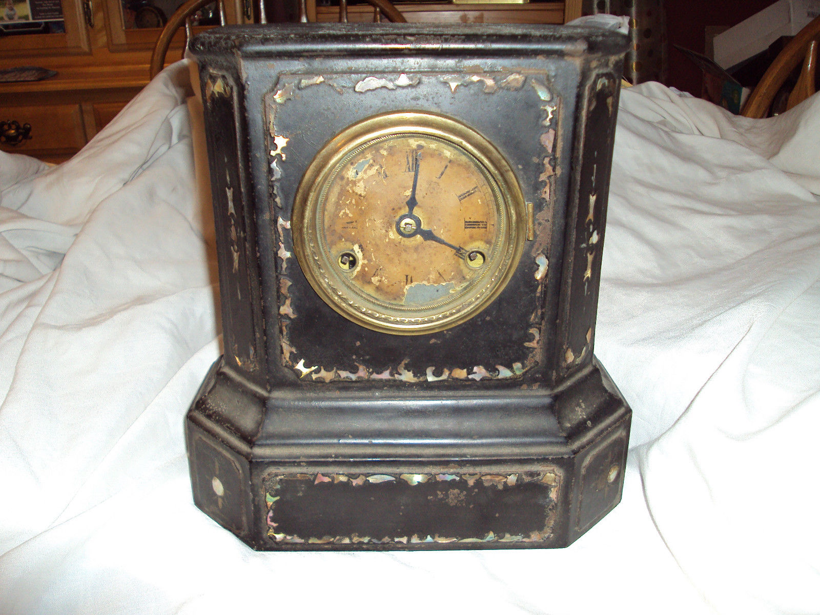 Title (ebay affiliate link): Antique Terhune & Edwards Iron Front Pearl inlay striking mantle clock repair