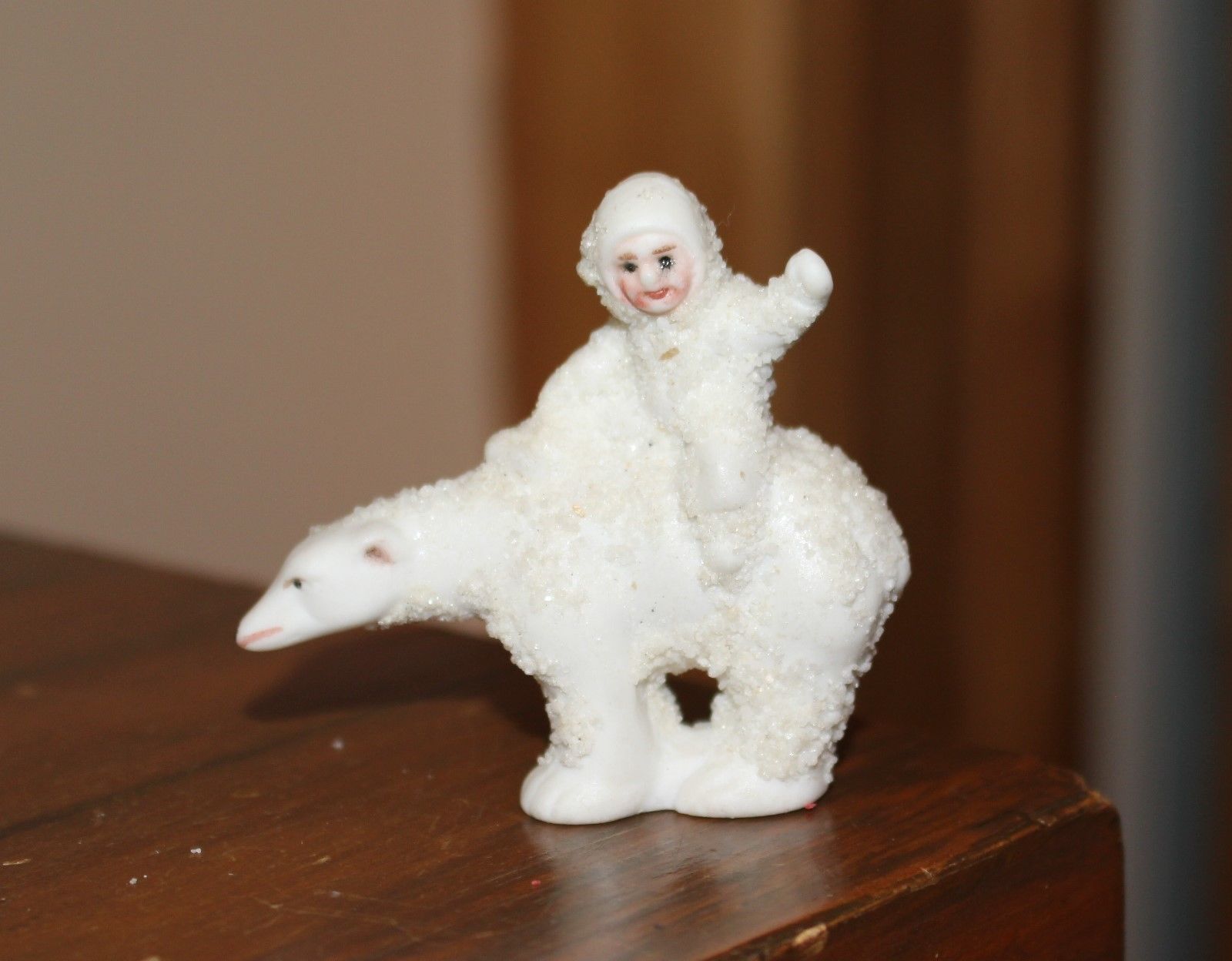 Title (ebay affiliate link): Snowbaby riding on a White Polar Bear. Miniature Bisque Figure. Japan. 1920s