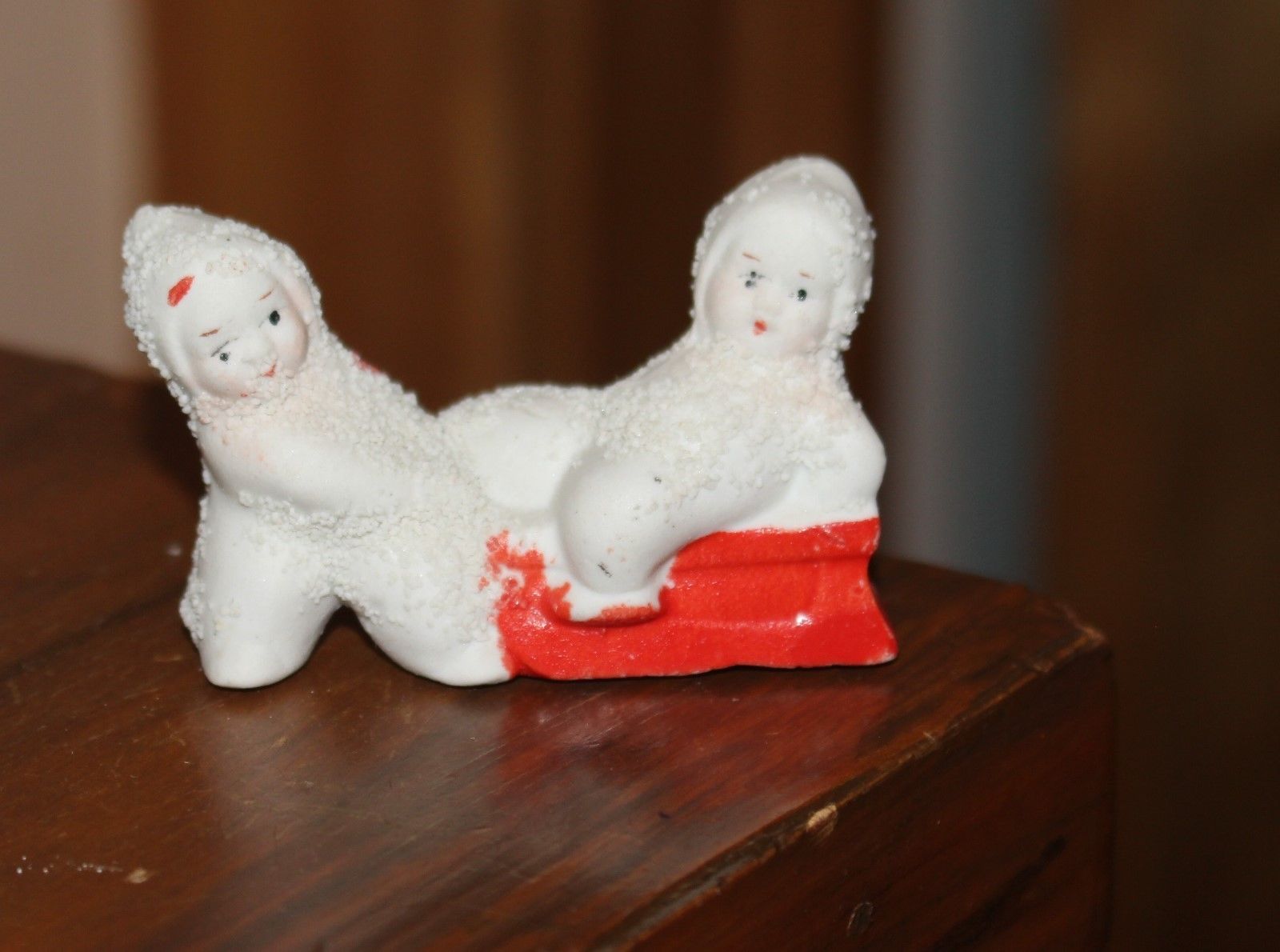 Title (ebay affiliate link): Snowbaby pulling friend on red Sled. Miniature Bisque Figure. Japan. 1920s