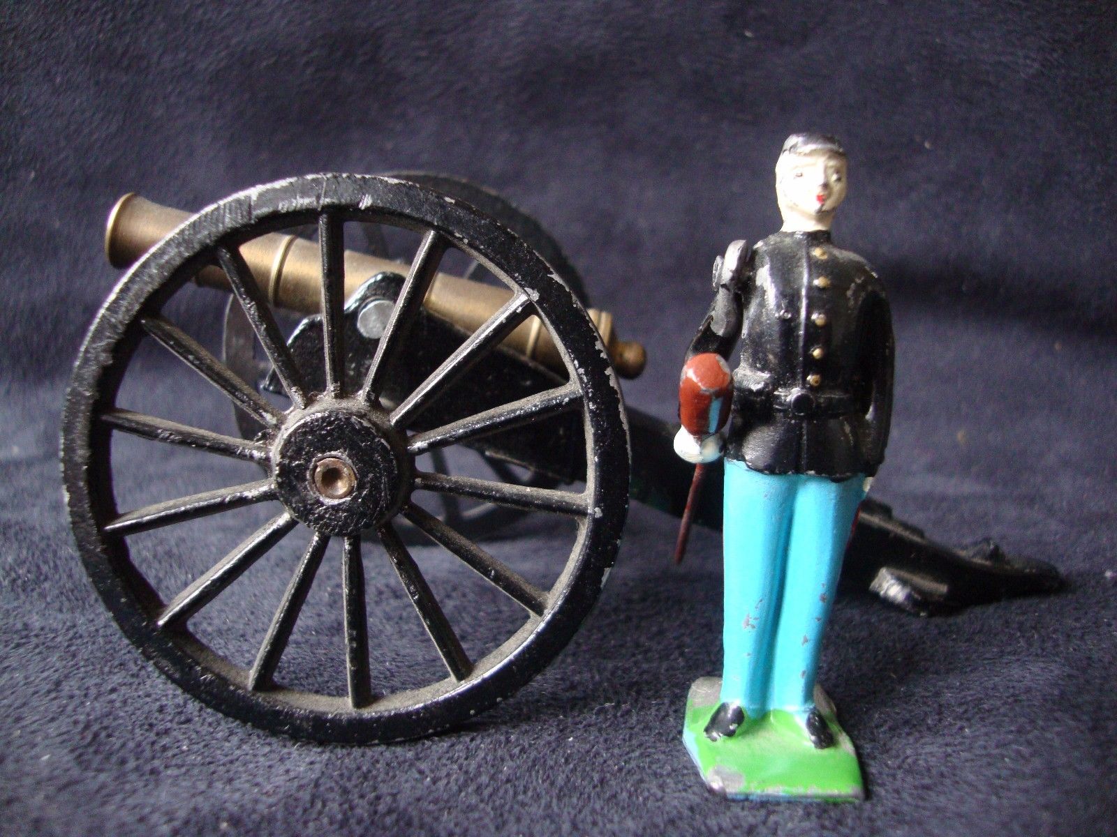 Title (ebay affiliate link): Vintage Toy Cast Iron Brass Civil War Union Cannon & Soldier. Made in Japan