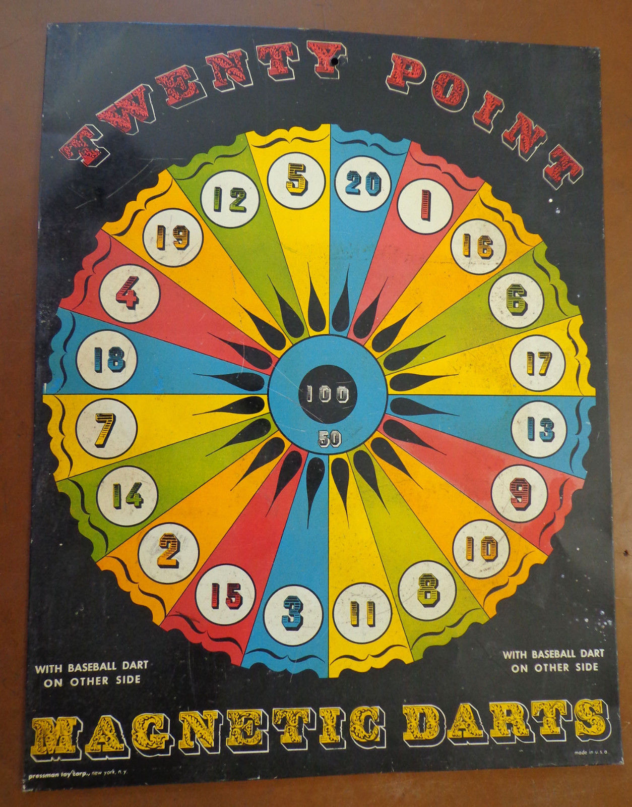 Title (ebay affiliate link): VINTAGE METAL BOARD~MAGNETIC DART GAME~2 SIDED~PRESSMAN TOYS~BASEBALL/20 POINT