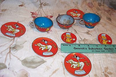 VINTAGE TIN PLAY DISHES-USED- CUTE CIRCUS MOTIF- LOW PRICE- OHIO ART?- NEAT LOT