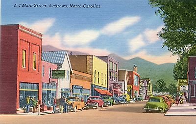 Title (ebay affiliate link): Andrews NC North Carolina, 1950's linen postcard, Main Street, lots of cars