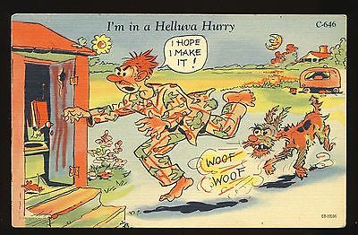 comic postcard linen outhouse man dog Helluva Hurry 1954 brainerd minn. cancel
