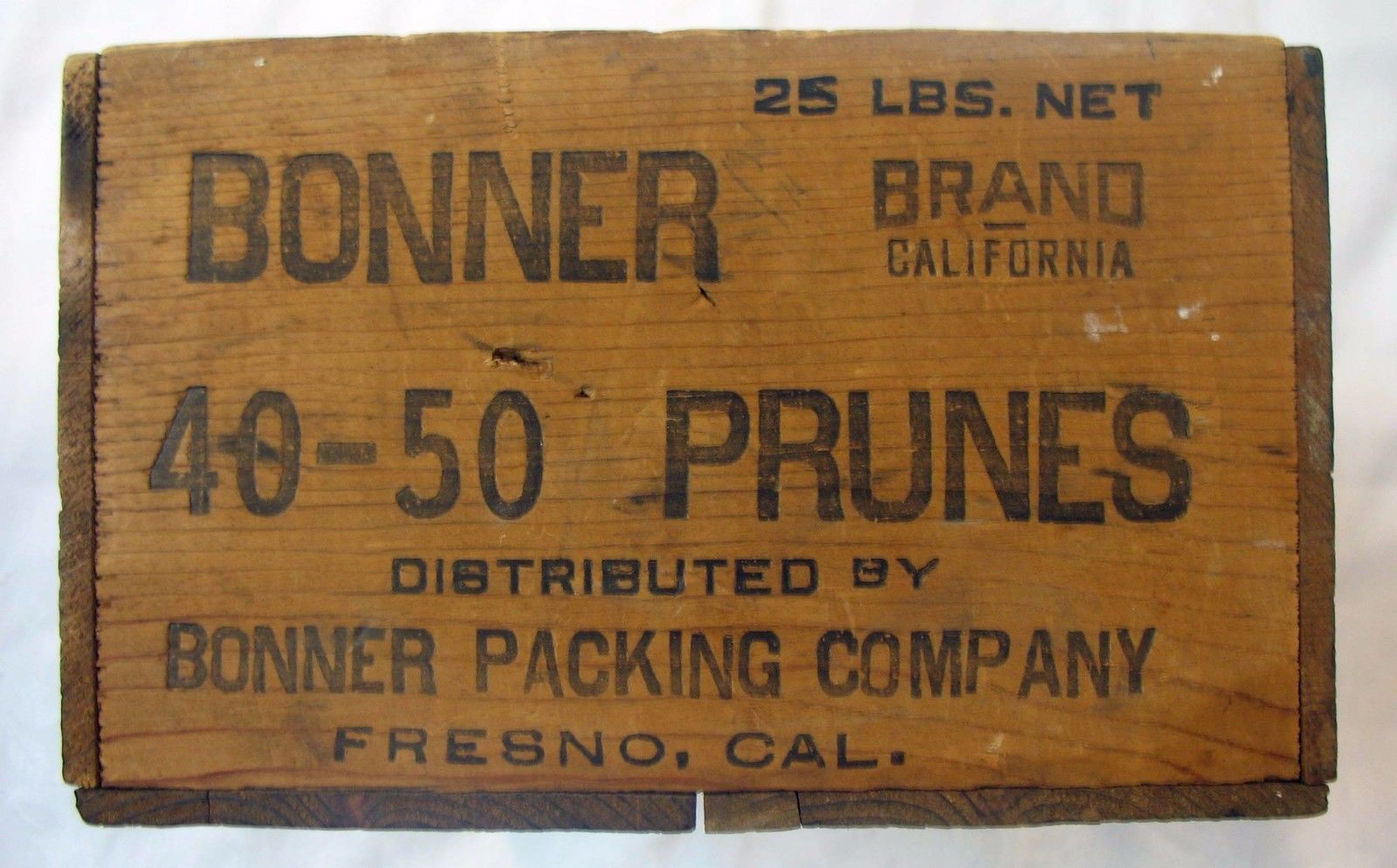 Title (ebay affiliate link): Vintage Wood Prune Box Crate Bonner Packing Co. of Fresno CA Good Condition