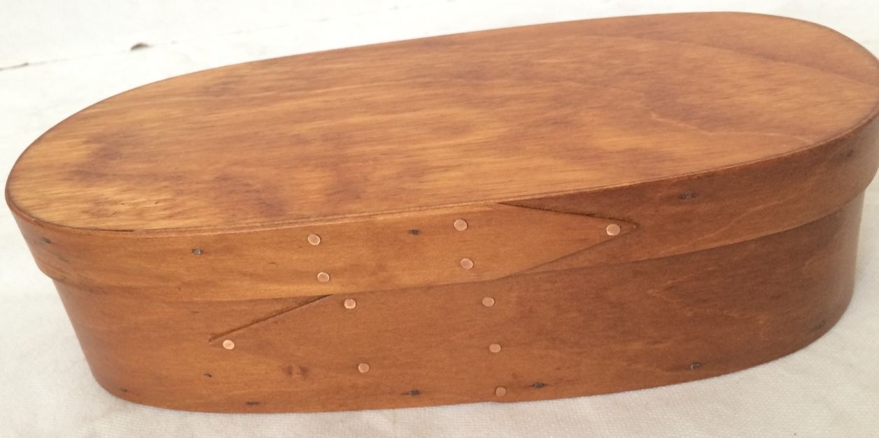 Title (ebay affiliate link): "Old Time Wooden Ware" Frye's Mill, Wilton, NH- 9 5/8" x 4 1/2" Oval Shaker Box