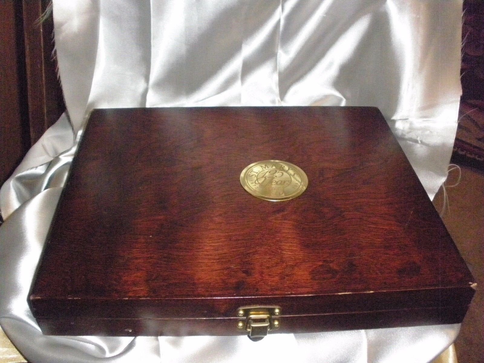 VINTAGE WOODEN BOX WITH MEDALLION ST MARYS 125 YEARS ON THE TOP.