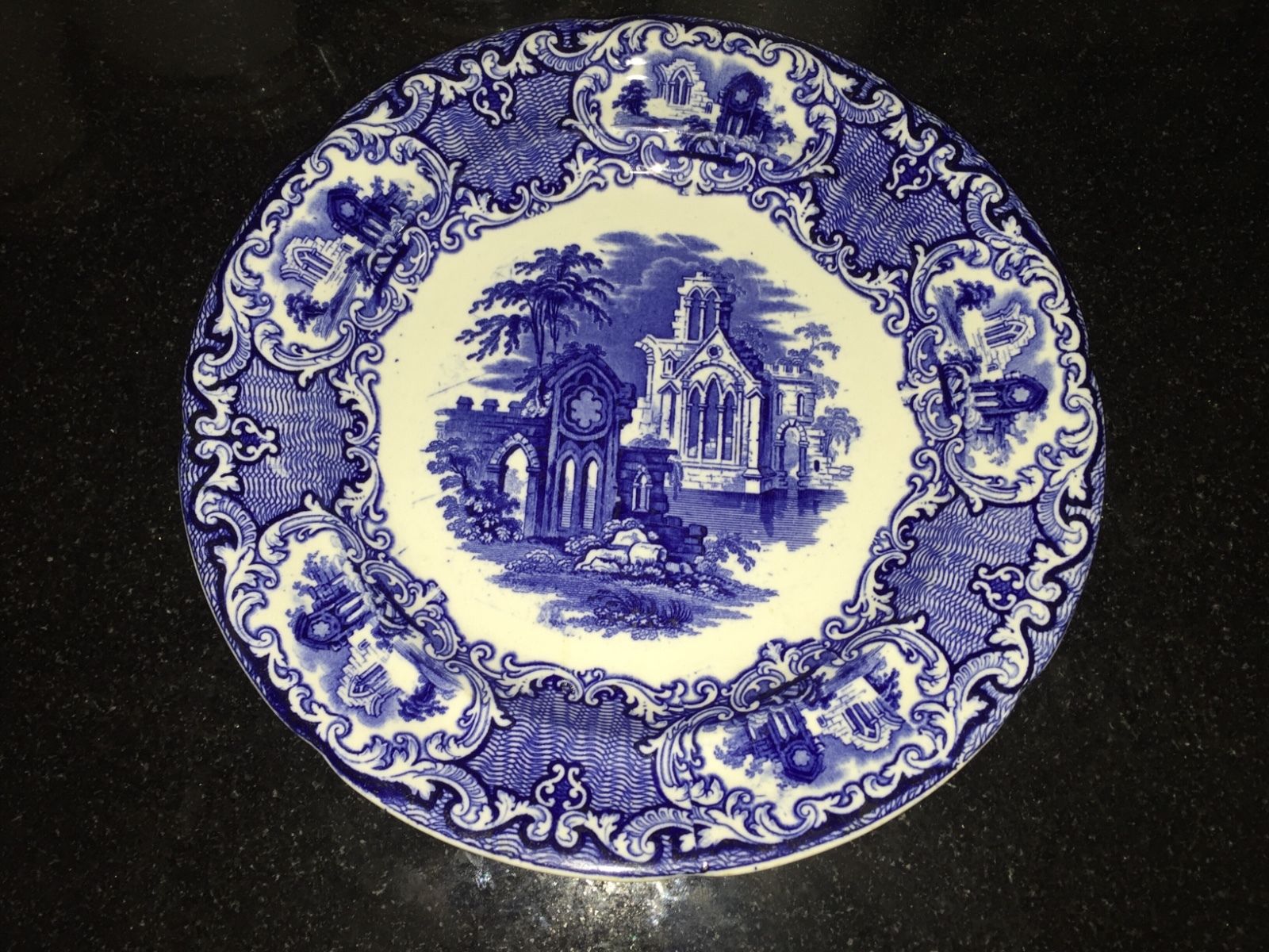 Title (ebay affiliate link): Antique George Jones & Son "Abbey 1790" Blue Transferware 10.5" Plate 1902