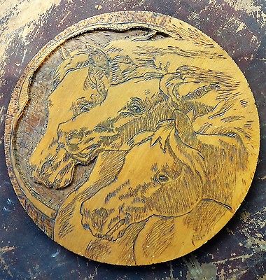 FLEMISH ART PYRO 3 HORSE HEADS ON 8 INCH VINTAGE