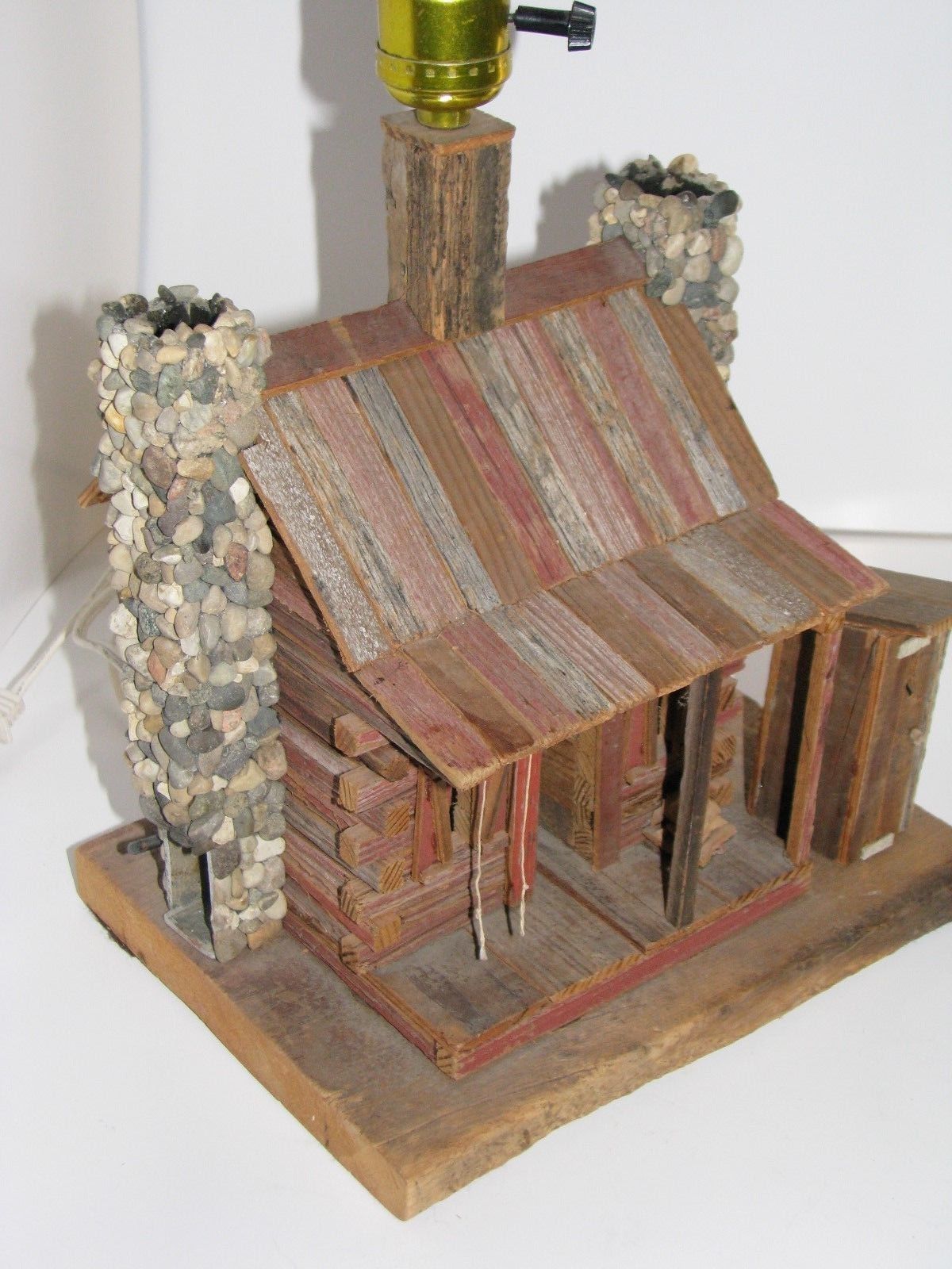 Title (ebay affiliate link): Antique Log Cabin Hand Made Primitive Folk Art Rustic Lamp Stone work Chiminey