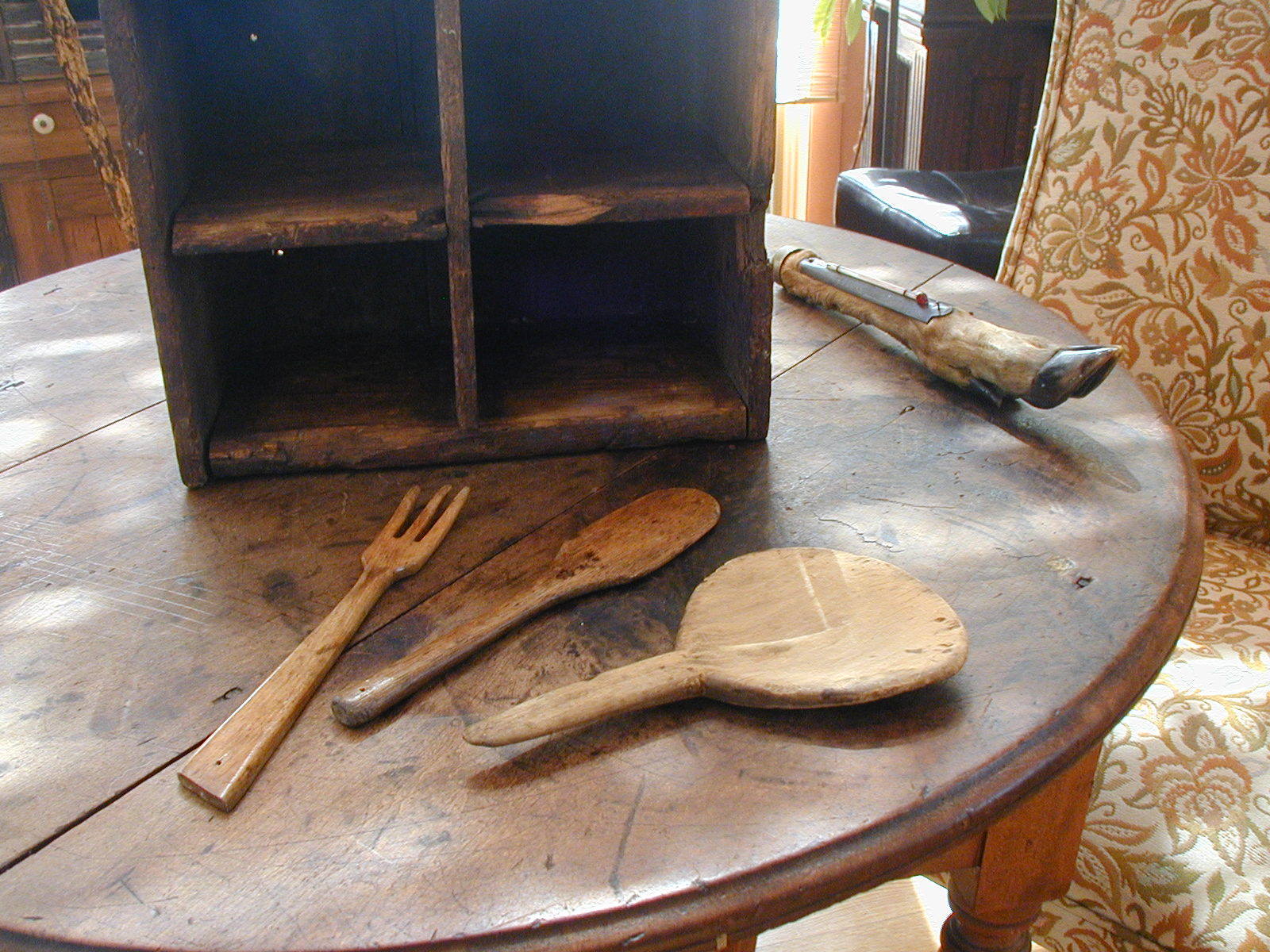 Title (ebay affiliate link): Old Primitive Lot of 2 Carved Wood Treen Butter Paddles and a neat old Fork