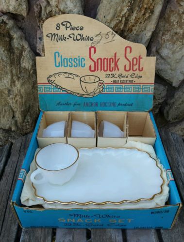 Title (ebay affiliate link): VTG ANCHOR HOCKING SWIRL SHELL 22K GOLD Rim 8 PC Milk Glass Snack Dish Set & Box