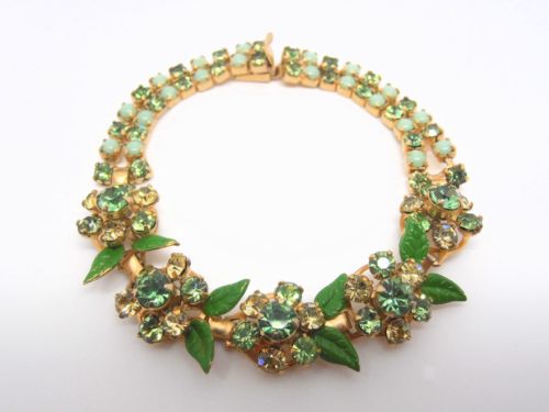 Title (ebay affiliate link): VINTAGE GOLD TONE BRACELET GREEN & MILK GLASS STONES WITH ENAMEL LEAVES WEISS