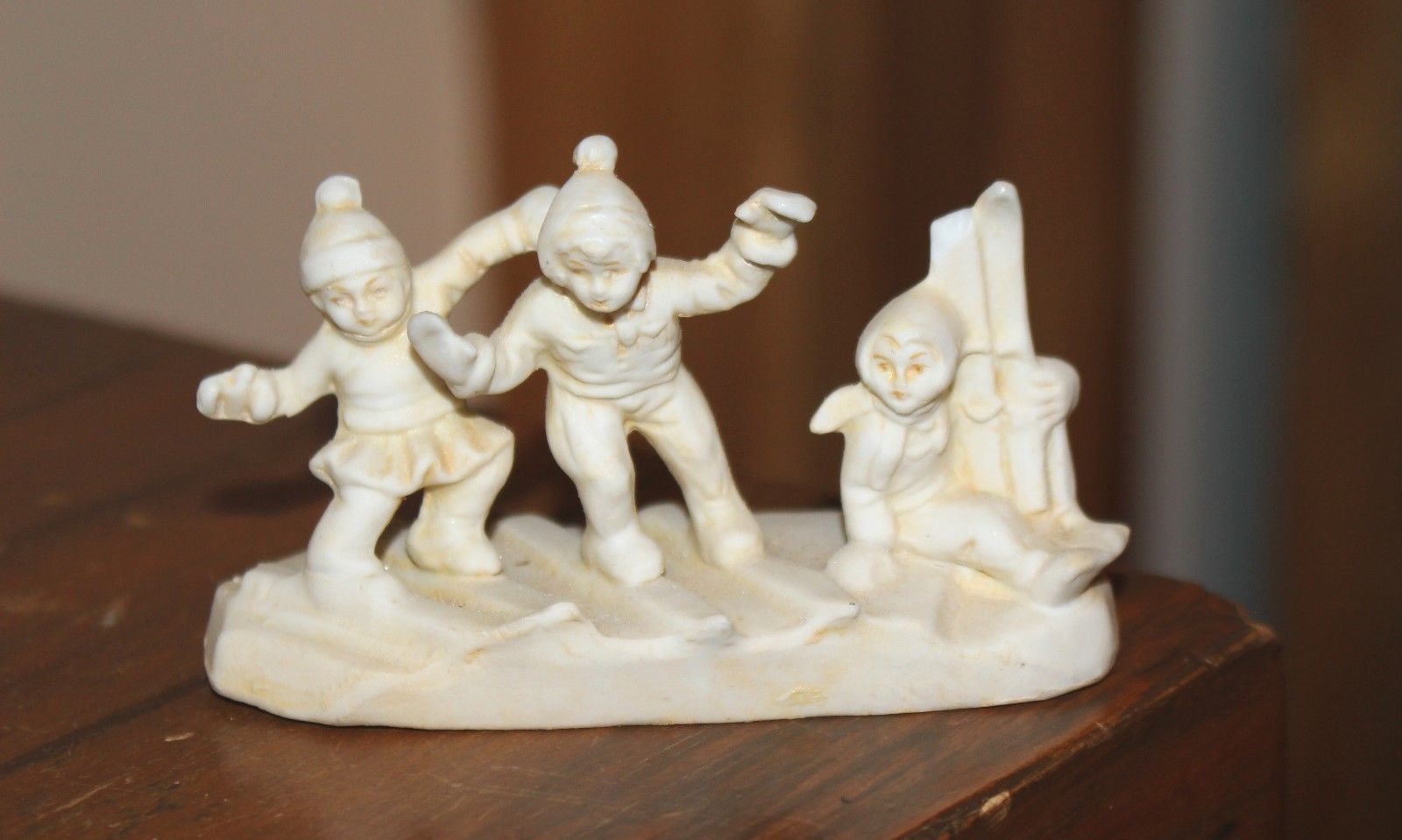 Title (ebay affiliate link): Three Miniature Children, on Skis. Great Miniature Bisque Figure. Early 1900s