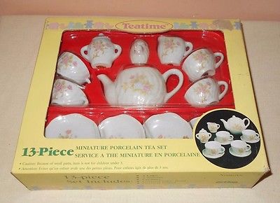 Title (ebay affiliate link): PRETTY VTG UNUSED TEATIME 13-PC MINIATURE TOY PORCELAIN TEA SET 1991 Flowers