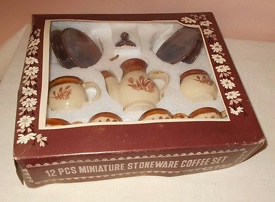 Title (ebay affiliate link): ADORABLE VTG 12-PC BROWN DRIP STONEWARE MINIATURE TOY TEA COFFEE SET Wheat & BOX