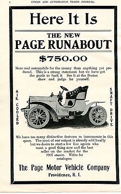 1906 PAGE RUNABOUT CAR MOTOR VEHICLE AD PALMER RUNABOUT CAR VEHICLE AD