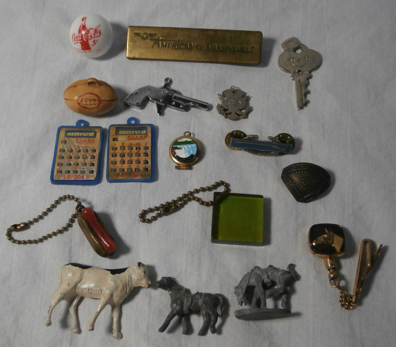 Title (ebay affiliate link): Vtg Antique Junk Drawer Lot Keychains Charms Coca Cola Marble infantry pin