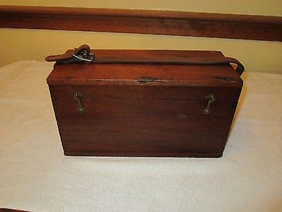 Title (ebay affiliate link): ANTIQUE DOVETAILED LEATHER HANDLE 2 LATCH HOOKED SALESMAN SAMPLE WOOD BOX