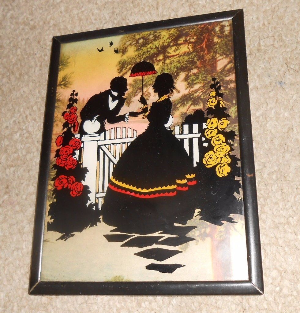Title (ebay affiliate link): VINTAGE COLOR SILHOUETTE PICTURE- VICTORIAN MAN COURTING A WOMAN IN THE GARDEN