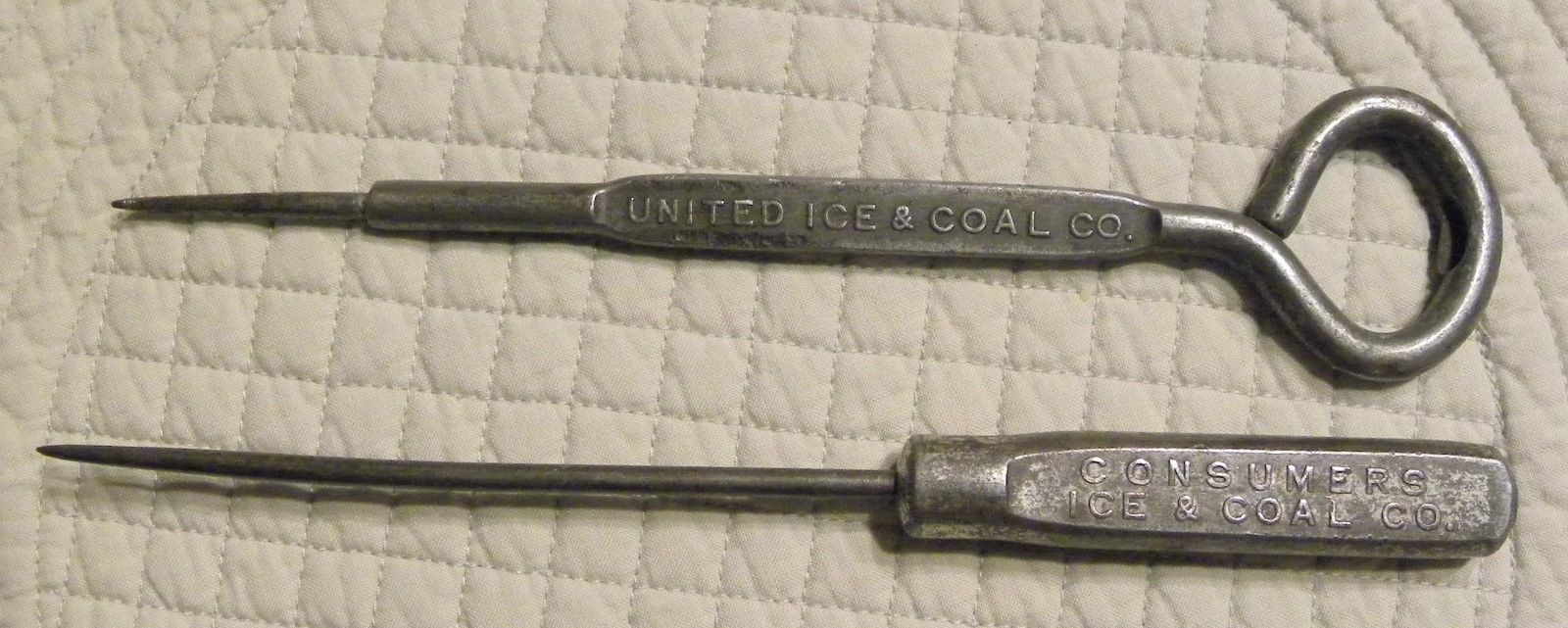 Title (ebay affiliate link): 2 Antique Vintage Metal Ice Picks-Consumers Ice & Coal Co.-United Ice & Coal Co.