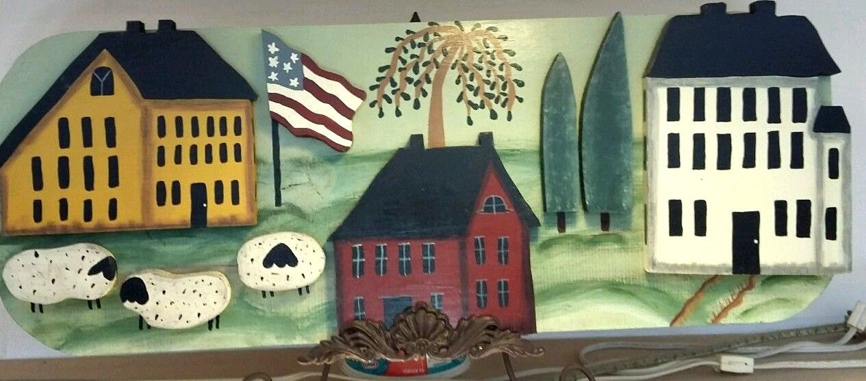 Title (ebay affiliate link): HUGE 3D FOLKART WOODCRAFT WITH SALTBOX HOUSES, AMERICAN FLAG, AND SHEEP~GORGEOUS