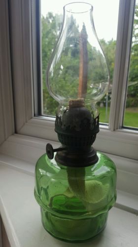 Title (ebay affiliate link): Lovely Vintage Paraffin Green Glass Lamp with Regulator & Wicker
