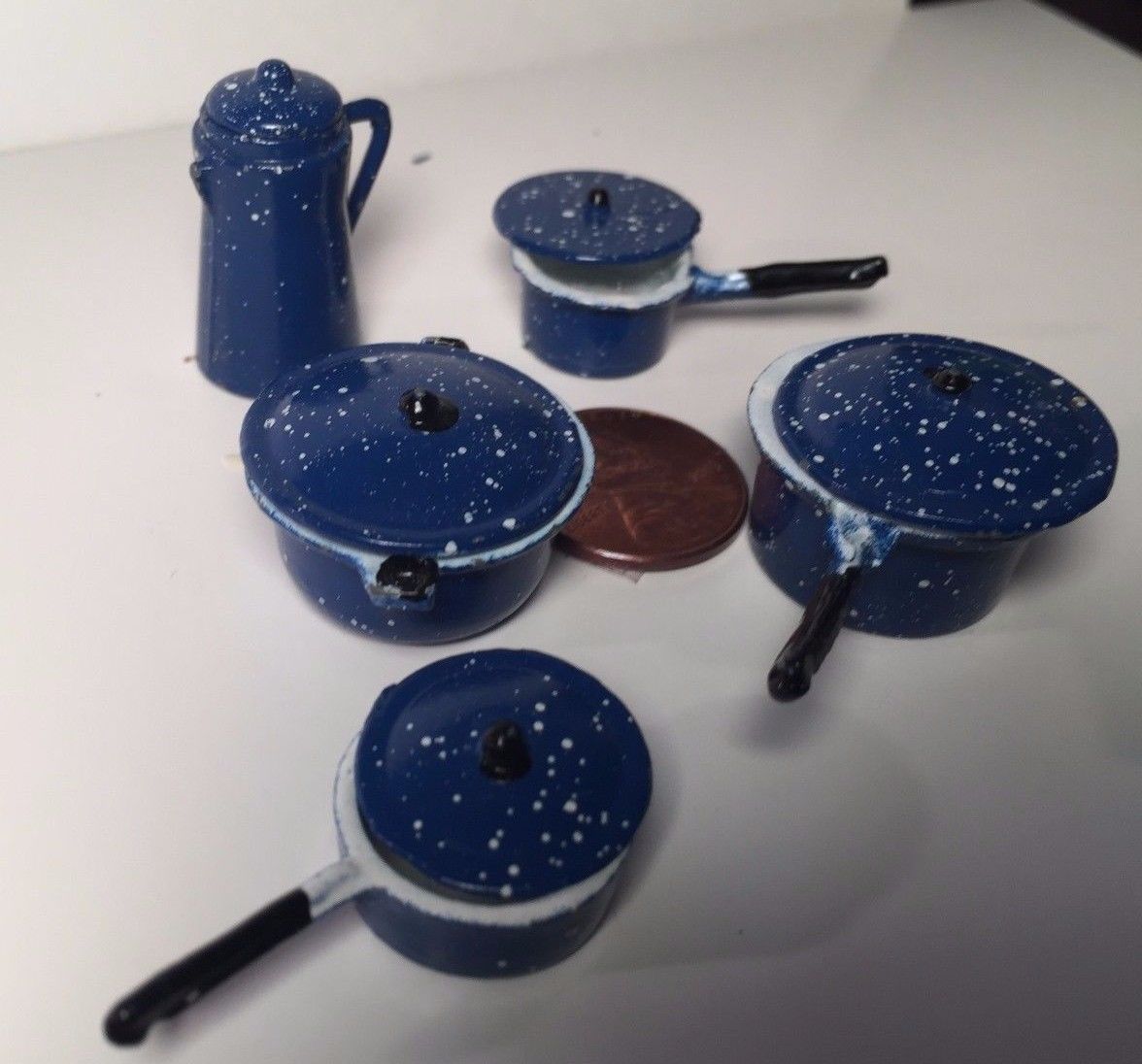 Title (ebay affiliate link): Antique Dollhouse Miniature Furniture 8pc Blue Metal Spatterware coffee pot/pans