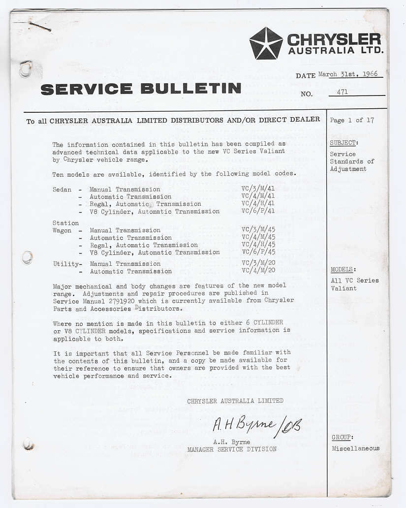 Orig March 1966 Chrysler Australia VC Valiant Dealership Service Bulletin