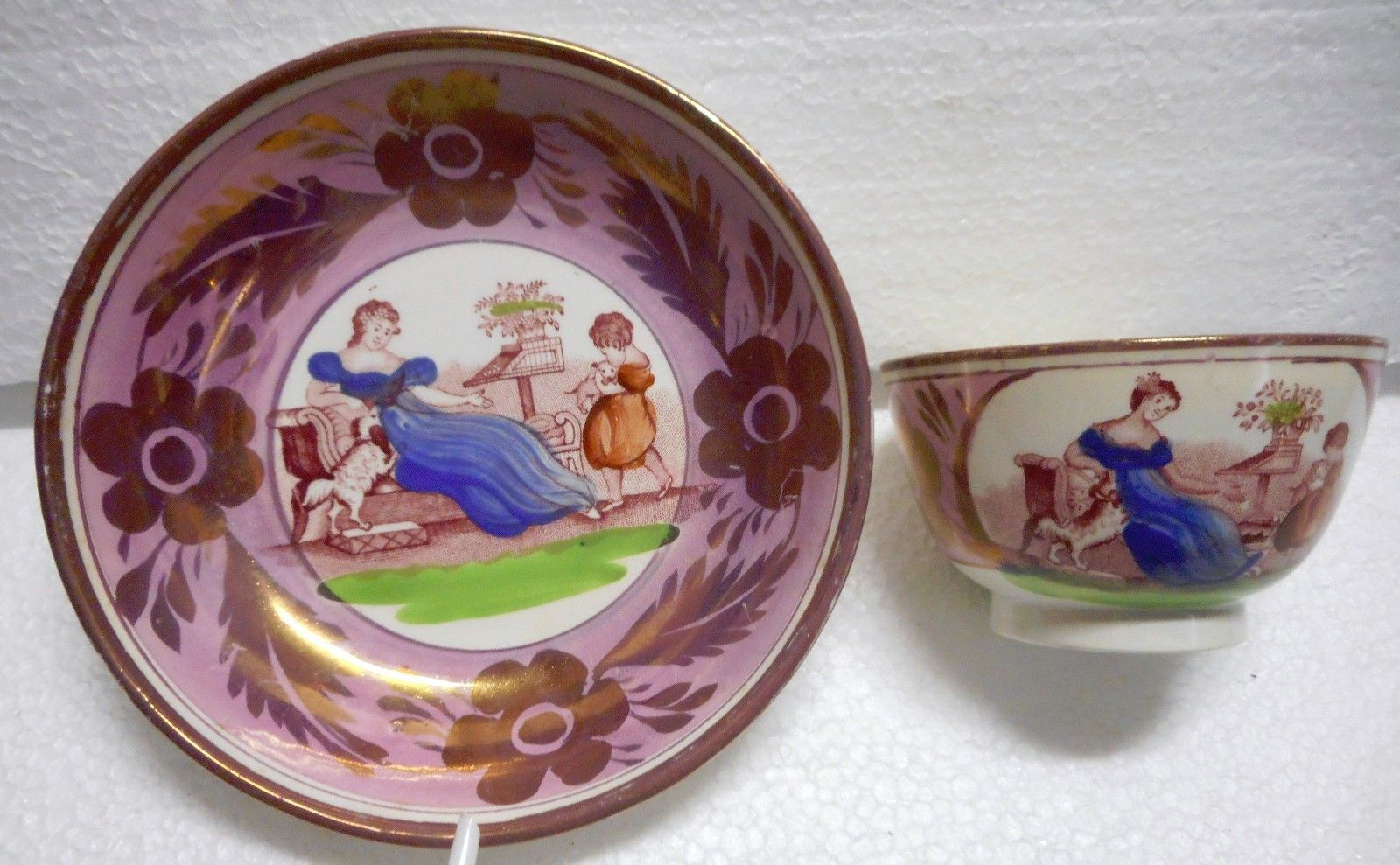 Title (ebay affiliate link): CA. 1840 ENGLISH DAWSON CO. PINK LUSTER DAWSON CO. HAND PTD. WOMAN, DOG, CHILD