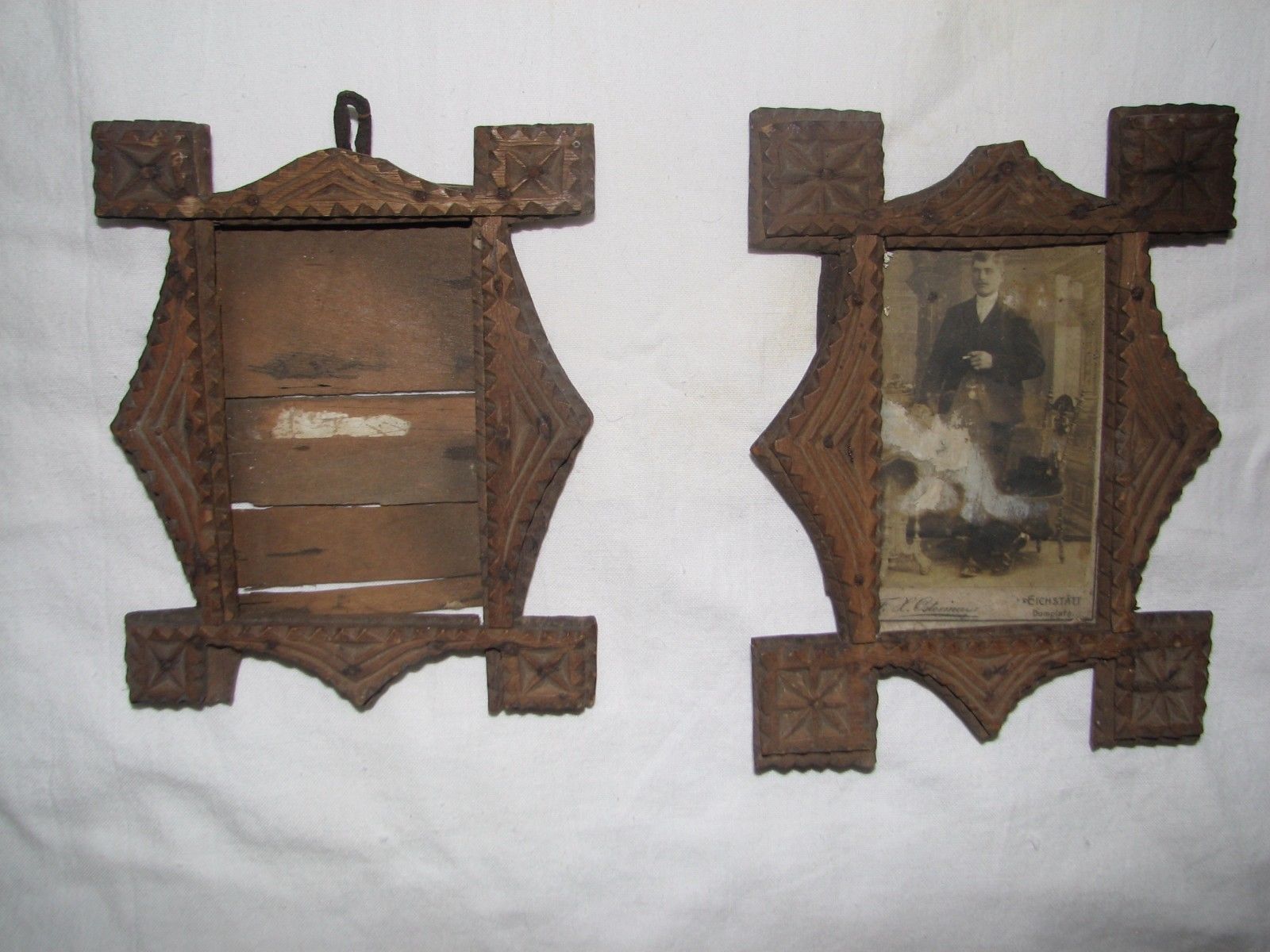 Title (ebay affiliate link): TWO small antique tramp art FRAMES Germany folk art primitive cigar box wood