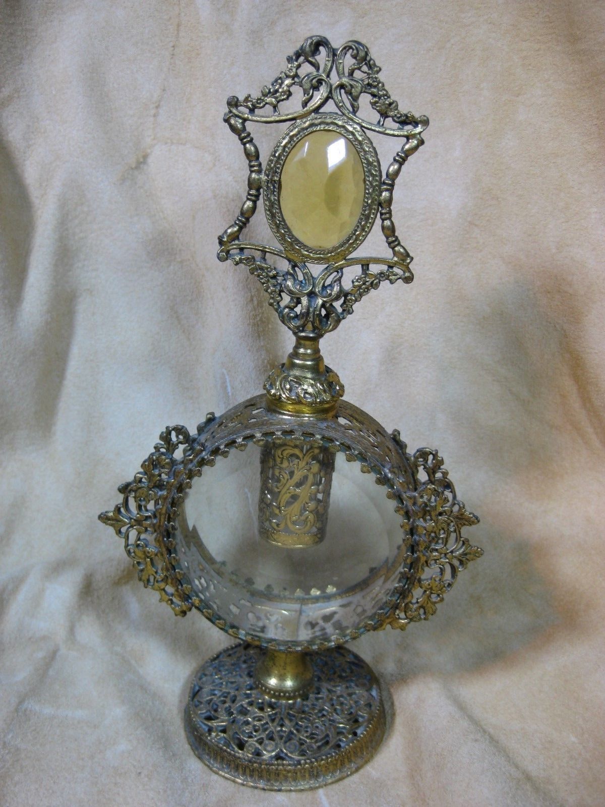 RARE Hollywood Regency PERFUME BOTTLE Filigree Gold Dabber/droper