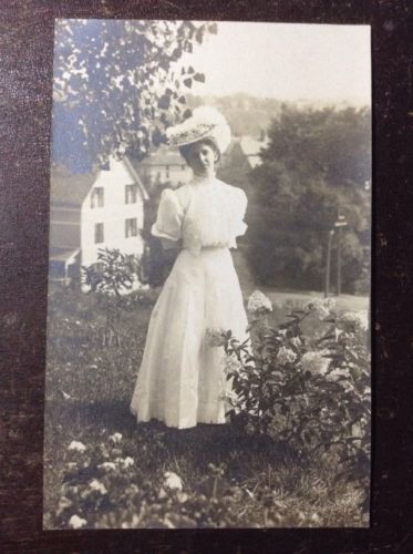 Title (ebay affiliate link): RPPC - Woman Posing In White Dress & Hat IFO White House, Early 1900s