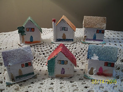 SIX 1940's Miniature Cardboard Putz House Ornaments Mica Trimmed To Restore