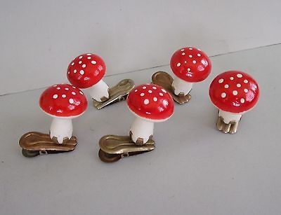 5 VINTAGE CLIP ON SPUN COTTON MUSHROOMS CHRISTMAS ORNAMENTS