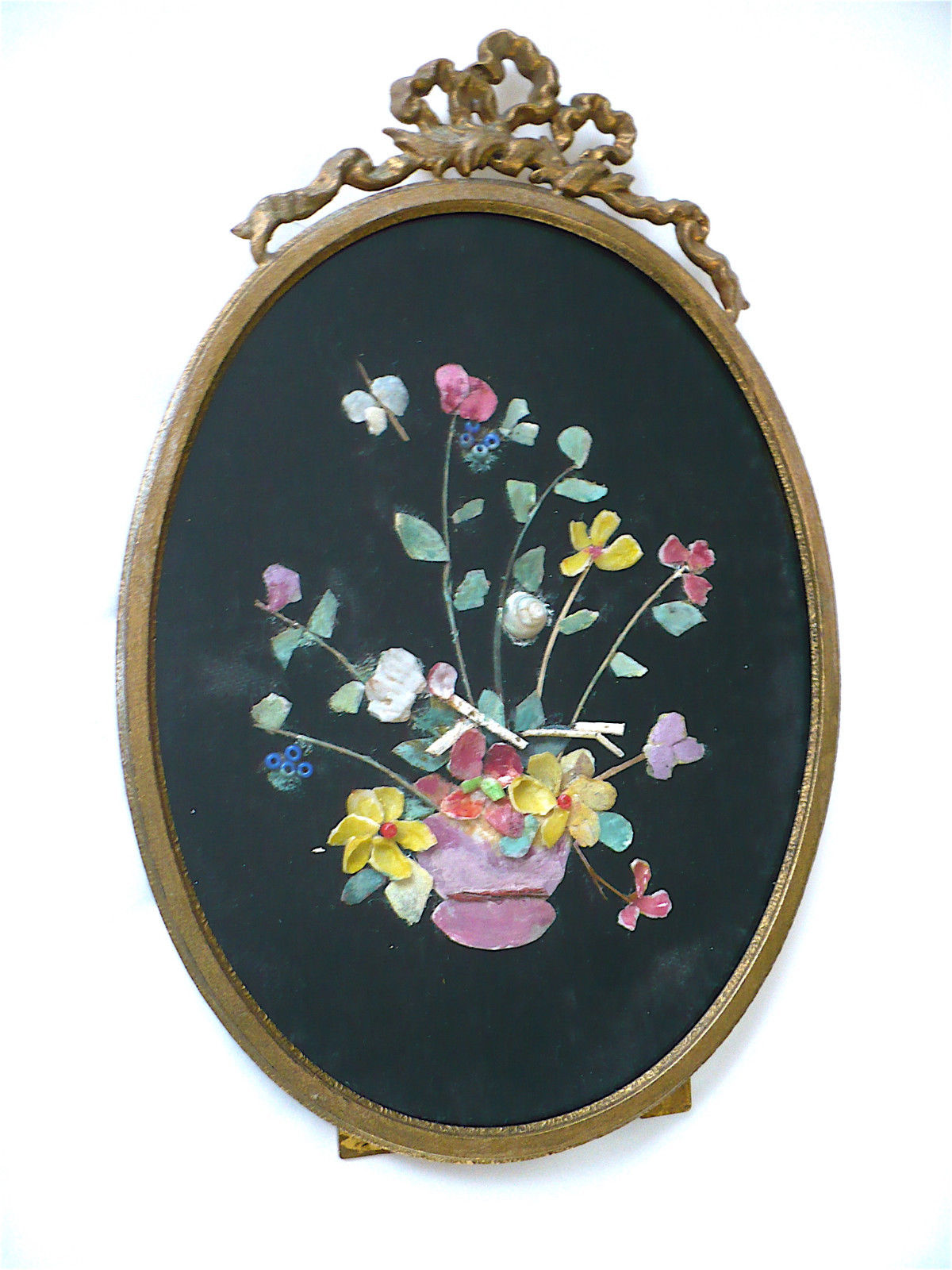 Title (ebay affiliate link): Antique Victorian Nouveau Brass Frame Shell Mosaic Basket Flowers Black Velvet