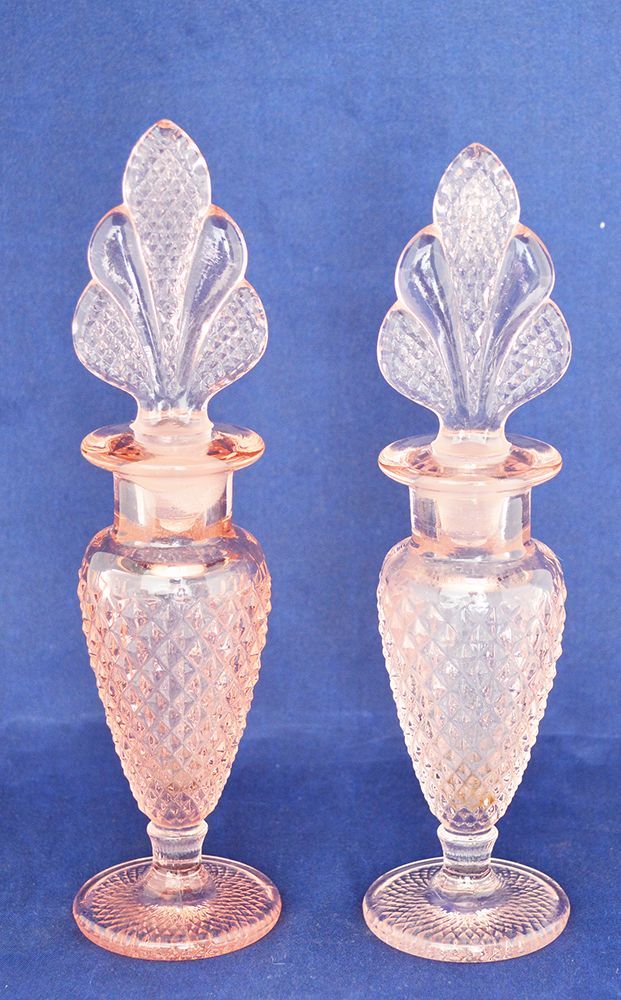 Set of 2 Pink Depression Art Deco Glass Perfume Bottles w/Stoppers