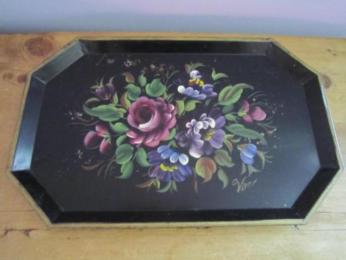 Title (ebay affiliate link): SALE! Vintage Tole Toleware Octagonal 16.5" Black & Gold Tray Handpainted Signed