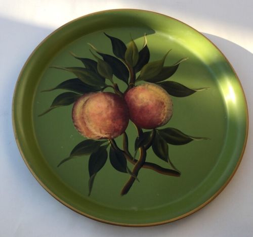 Title (ebay affiliate link): Vintage Antique Hand Painted 13.5" Brass / Bronze Tole Ware Tray Fruit Peaches