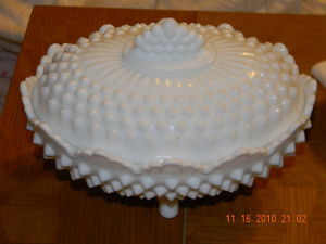 FENTON WHITE MILK GLASS HOBNAIL FOOTED LIDDED OVAL DISH